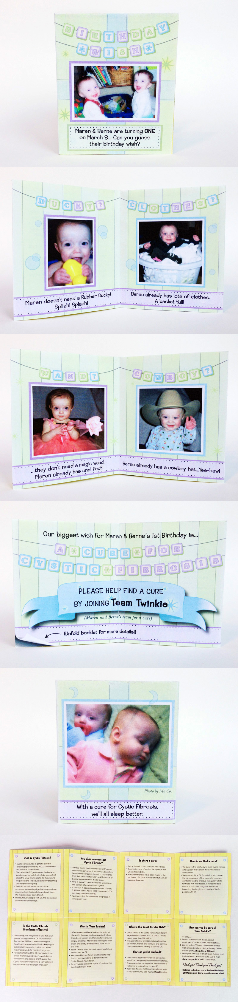 Maren and Berne's first birthday was fast approaching and their parents wanted to do something a little different. The twins were born with Cystic Fibrosis and it was their parents dream to one day find a cure. The birthday card helped to educate people on Cystic Fibrosis and what we can do to help.