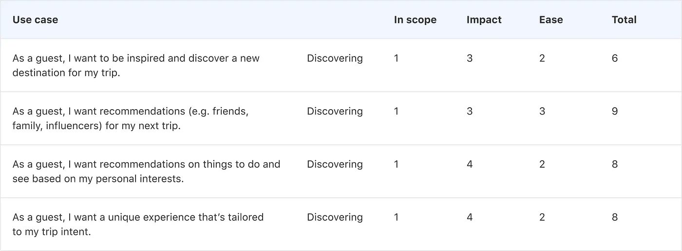 After summarizing the use cases, HMW statements, challenges and opportunities, we consolidated them in a centralized spreadsheet. We then prioritized each use case based on 3 criteria: