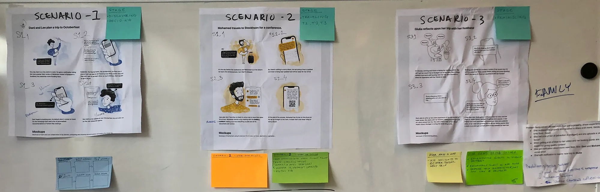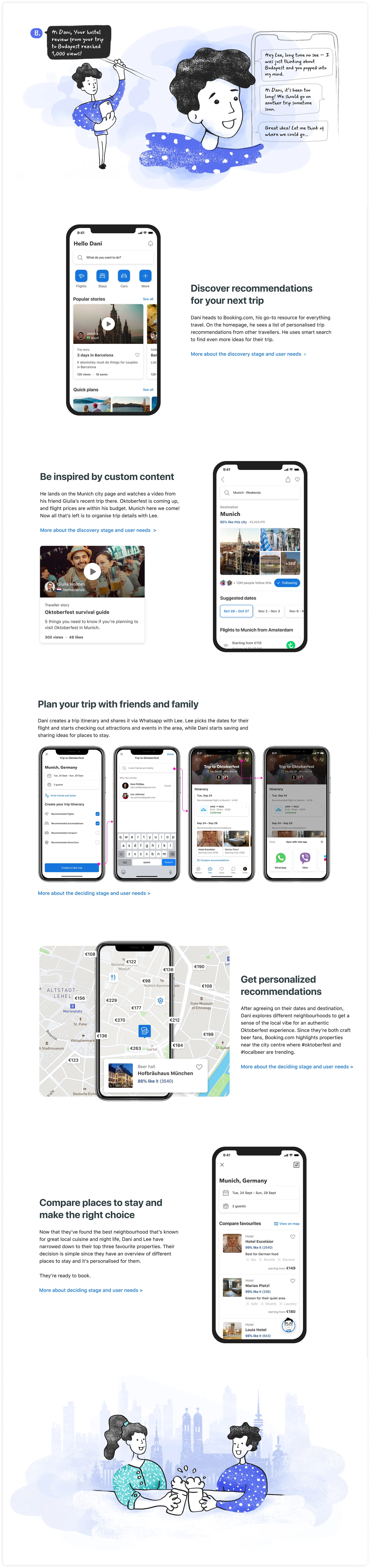 Each story represented a different type of user, during a different stage of the journey, and showcased the ideal travel experience. The stories were supported by visual concepts of the Booking.com app and what the product experience could be. Not only did they demonstrate how we could solve user problems, but they also tied back to the company objectives.